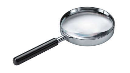 A meticulously detailed magnifying glass, shiny polished silver frame, matte black ergonomic handle, clear convex lens, on transparent infinite studio background with ample copy space, a concept of