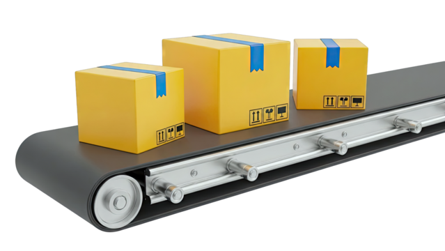Cardboard boxes moving on a conveyor belt in a warehouse or factory setting isolated on transparent background