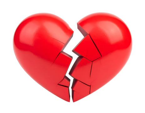 A vivid red heart, broken into multiple fragments, conveys the intense feeling of heartbreak and separation.