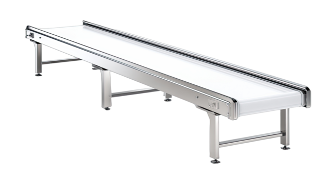 Long, industrial conveyor belt with stainless steel frame and white belt
