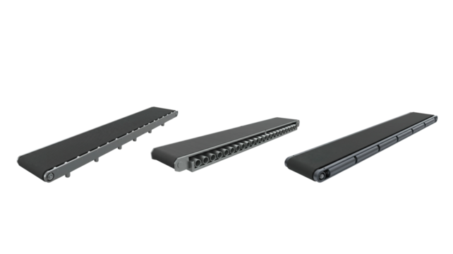 Isolated industrial conveyor belt system on the factory floor for product manufacturing