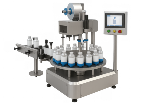 Labeling machine applying labels to bottles on transparent background