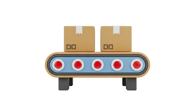 Row of brown cardboard boxes on conveyor belt transparent background