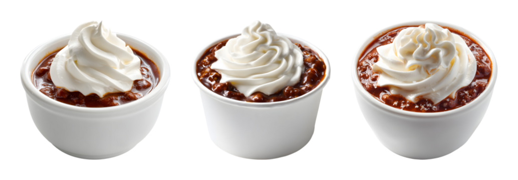 Delicious chili con carne with sour cream in white bowl PNG set with transparent background