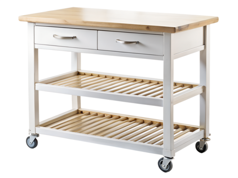 White kitchen island cart with wooden top, drawers, and shelves on wheels, isolated on transparent background, ideal for extra storage