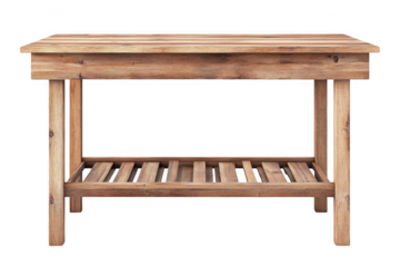 Rustic wooden kitchen island table with shelf, butcher block style, farmhouse furniture, vintage counter, kitchen decor, isolated on transparent background