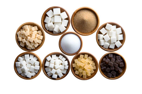 Sugar & Candy Variety: Wooden bowls filled with white, brown sugar, & colorful cube candies on black. Use for food photography or cookbook designs.