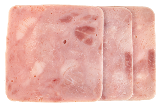 Three slices of smoked ham steak with visible grain and fat isolated on transparent background