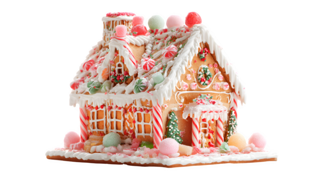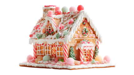 Isolated birthday cake with lit candles and a festive gingerbread house cookie, featuring sweet icing and candy decorations for a winter holiday Christmas celebration