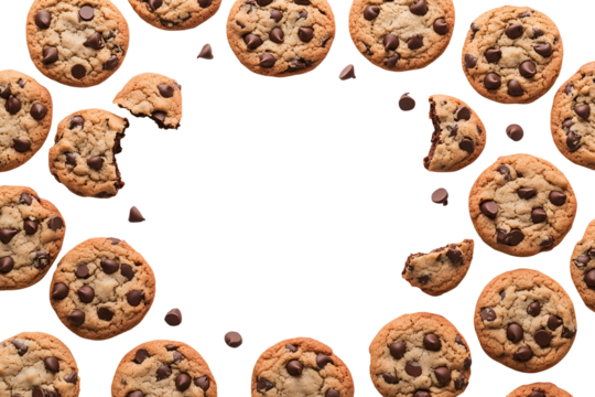 Chocolate chip cookie cookies food biscuits, broken pieces bitten scattered flat lay overhead top view on transparent template cutout, PNG file. Mockup frame for artwork. Wallpaper banner border