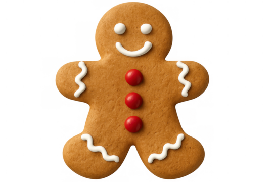 Gingerbread man cookie decorated with white icing and red buttons is smiling on a transparent background