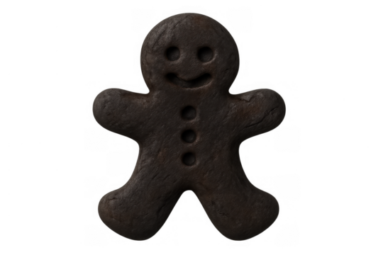 Burnt gingerbread man cookie with a sad face, an overcooked baking failure on transparent background