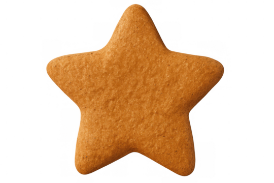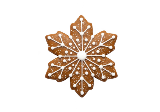 A single gingerbread cookie shaped like a snowflake, decorated with white icing, isolated on transparent background