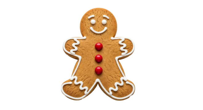 Gingerbread cookie shaped like a man with frosting and candies on white background with copy space