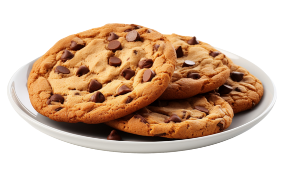 Three delicious chocolate chip cookies on a pristine white plate