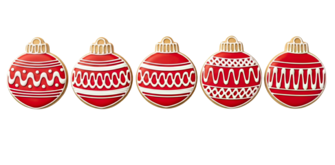 Five festive gingerbread cookies, beautifully decorated as Christmas ornaments with intricate red and white icing patterns, presented against a stark black background