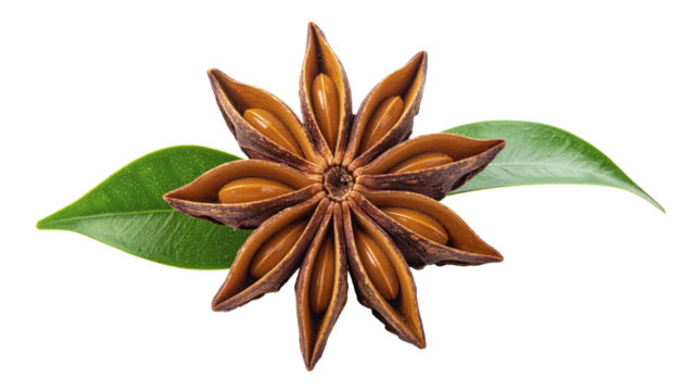 Single star anise pod with green leaves isolated on transparent background. Fresh herbal spice concept for tea, aromatherapy, organic branding and culinary packaging.