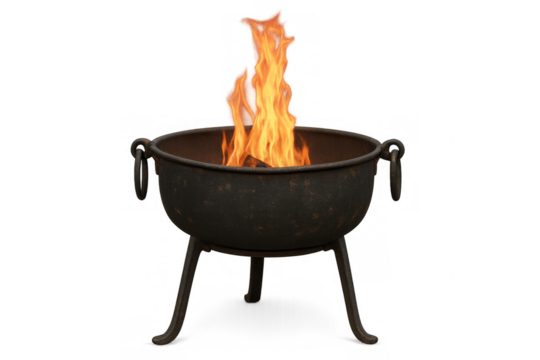 Cauldron boiling over campfire with fire flames and logs, ancient fantasy cooking, transparent background