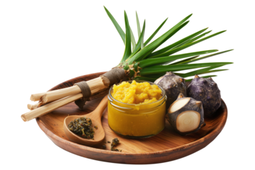Pandanus fruit paste in wooden bowl with fresh pandanus leaves and fruit on wooden plate, isolated on white transparent background, concept of tropical cooking