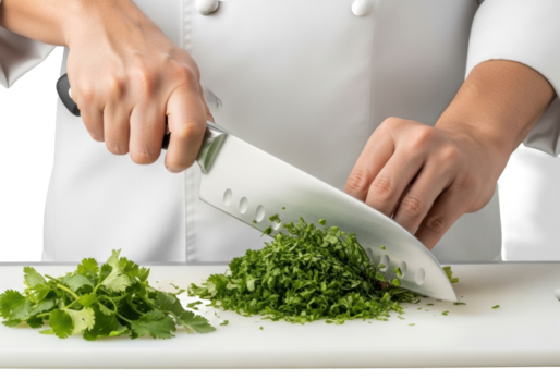 Adult chef's hands precisely chopping vibrant fresh green parsley and cilantro with a gleaming stainless steel knife on a cutting board, isolated on transparent, dynamic culinary expertise