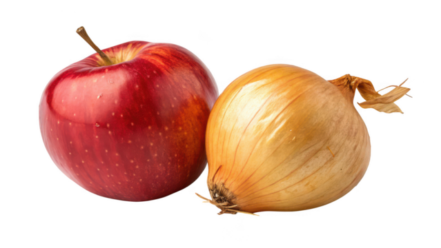 Red apple and yellow onion side by side isolated on transparent background
