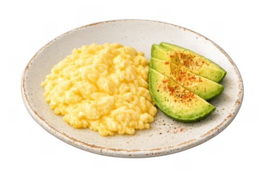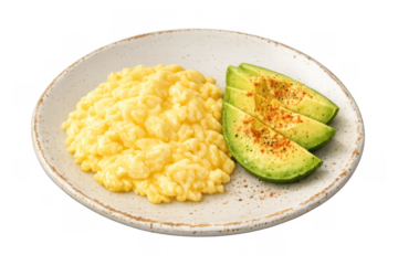 Scrambled eggs and sliced avocado on plate, high protein keto breakfast or healthy meal preparation, transparent background