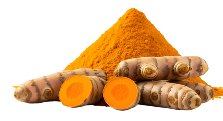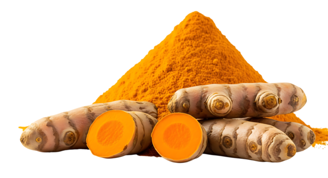 Bright orange turmeric powder pile with fresh turmeric root slices on transparent background.