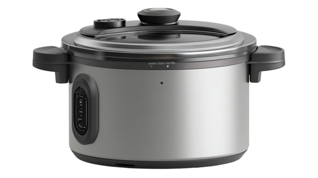 Silver pressure cooker.  Modern, rounded, stainless steel pot with a lid.  Control panel visible.  Handles on top and bottom.  Kitchen appliance