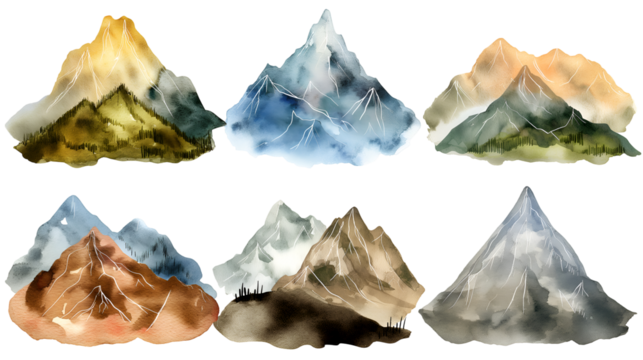 Collection of six distinct watercolor illustrated mountain range icons featuring varied earthy and cool color palettes perfect for nature designs