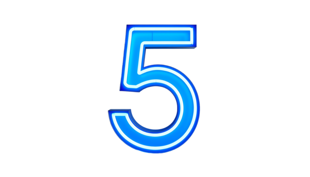 Illuminated number five glows vibrantly with a blue neon effect against a stark black backdrop. The modern design radiates energy