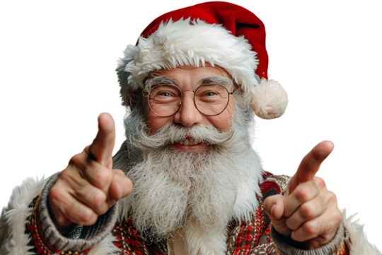 Portrait of stylish trendy funny Santa pointing at camera on transparent background