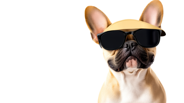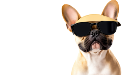 Two stylish French Bulldogs wearing colorful shirts and sunglasses isolate on transparent background, cutout, png