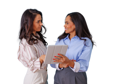 Two professional businesswomen collaborating, discussing work, and exchanging ideas using a digital tablet. Transparent background