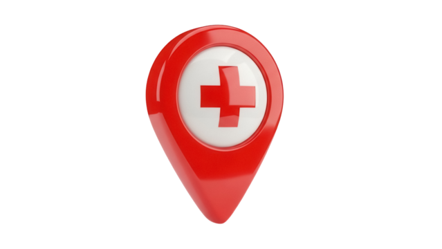 Red location pin with medical cross PNG isolated on transparent background, healthcare and hospital navigation icon