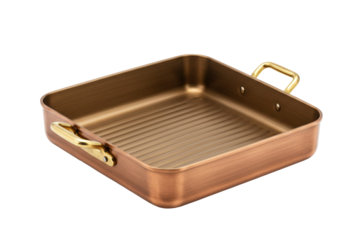 Copper square grill pan isolated, cookware with golden handles for grilling and roasting on a transparent background