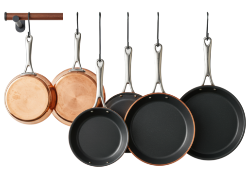 Premium copper frying pans, skillets, and crepe pans hanging on racks against a transparent background. Concept for high-end culinary advertising