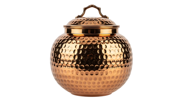 Hammered copper water pot with lid, traditional indian utensil isolated on transparent background