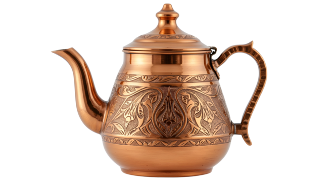 An ornate antique copper teapot with intricate traditional engravings, isolated on a clean transparent background