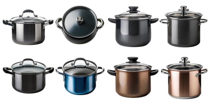 A set of copper pots and pans with a dark brown color, on a transparent background PNG