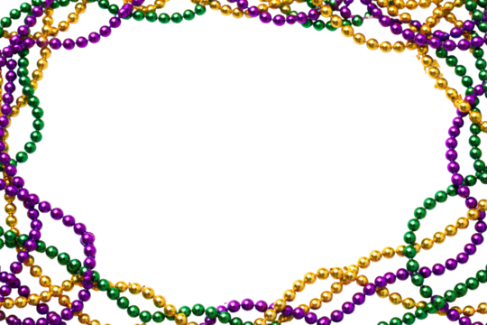Mardi Gras beads frame featuring colorful beads border isolated on transparent background with copy space for festive carnival celebration design.