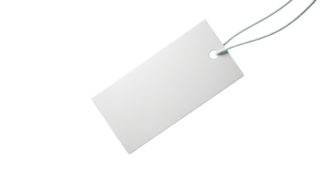 Blank white rectangular price tag or label with string attached, isolated on transparent background