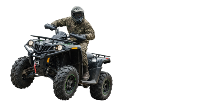Male rider in woodland camouflage helmet and tactical gear aggressively riding a powerful black quad bike on a white studio background, high-speed photorealistic shot. Concept for extreme off-road