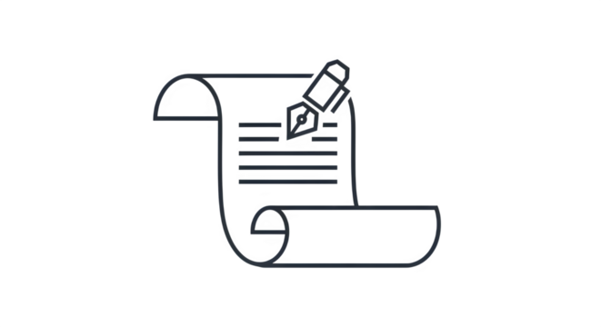 Outline icon of a rolled paper document with text and a fountain pen writing on it, concept of contract or signature isolated on transparent background