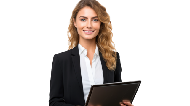 Portrait of young smiling woman holding laptop and looking at the camera. Transparent background or PNG file. Generated by AI