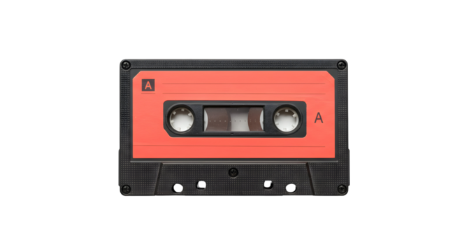 An old vintage cassette tape from the 1980s (obsolete music technology). Vivid colors: coral red plastic body, orange paper label. Isolated.