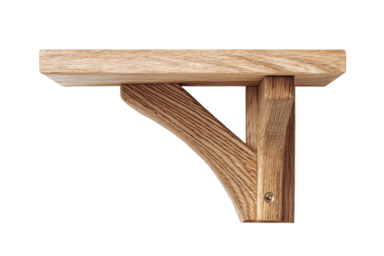 Wooden wall mounted shelf with a sturdy corbel support.