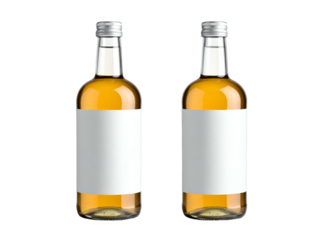 Two amber liquid bottles with white labels, silver caps
