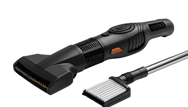 Small vacuum cleaner brush red, black isolated on cut out PNG or transparent background. Concept of household chores. Battery-powered cordless vacuum cleaner technology equipment.