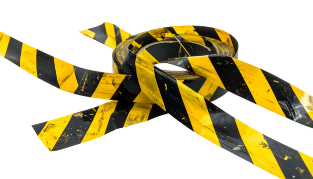 Yellow warning tape PNG isolated on transparent background, caution barrier for construction site and crime scene