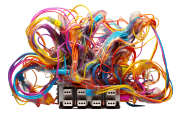 A power outlet bursting with colorful cables and cords, representing connectivity and energy flow, isolated on a white background